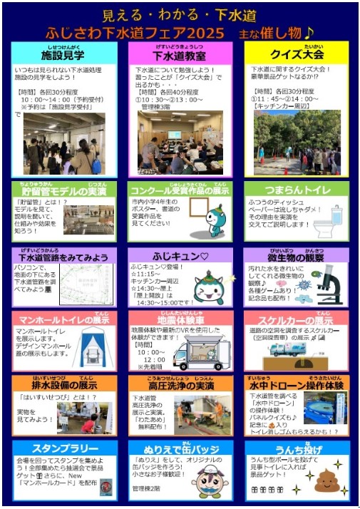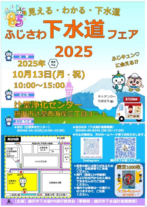 2025年10月13日(月・祝)に辻堂浄化センター(藤沢市辻堂西海岸三丁目3-1)で開催される「ふじさわ下水道フェア2025」に参加致します。