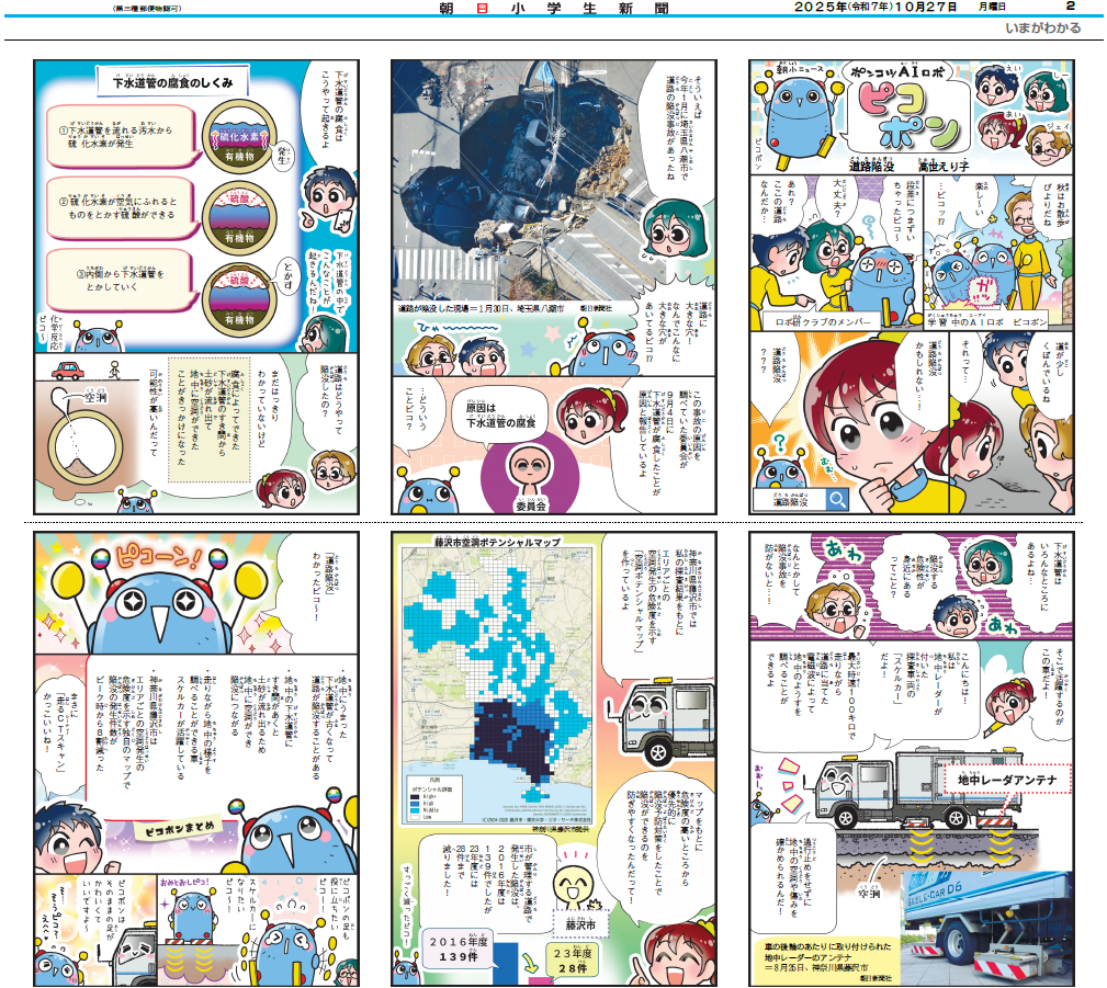 2025年10月27日発行の朝日小学生新聞に掲載された、道路の陥没をテーマにしたマンガの中で、当社の陥没予防調査技術「スケルカー」や、藤沢市・東京大学・当社が共同開発した「空洞ポテンシャルマップ」が紹介されました。