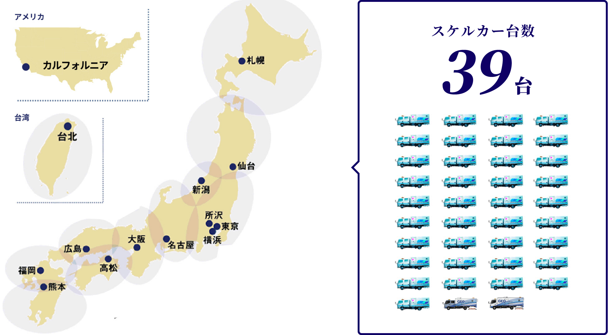 スケルカー®の保有台数は、世界最多の39台(2025年4月末現在)。行き届いたオペレーション体制で、全国各地の事務所から、12時間以内に現場に駆けつけます。いつ、どこで起きるかわからない自然災害にも素早く対応する機動力を兼ね備えています。